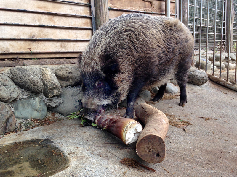 多摩動物公園は木々に囲まれ、園内に里山の自然が残っています。そこで、園内で季節ごとにとれる植物などをイノシシのメス2頭「キントン」と「クロマメ」に与えてみました。