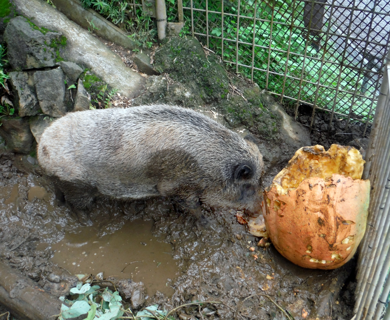 今は園内でドングリが落ちる季節ですが、イノシシたちも運動場に落ちたコナラやクヌギのドングリを食べています。野生では今回与えてみたもの以外にも、イノシシはたくさんのものを食べて生きています。イノシシの食べるものを通じて、日本の山の実りの豊かさを少しでも感じていただけるよう、これからも与えるえさに工夫をしていきたいと思います。