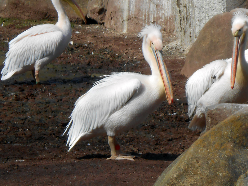 サバンナにいるモモイロペリカンは12羽(オス7羽、メス5羽)。2016年10月中旬から食欲が増し、頭の上の飾り羽が長く伸びるなど、繁殖期の特徴が現れました。えさは1日1回午後2時頃にアジを与えていますが、夏は1羽につき1キロを目安にしていたのに、食欲旺盛になった今では1羽につき2キロに増えました。