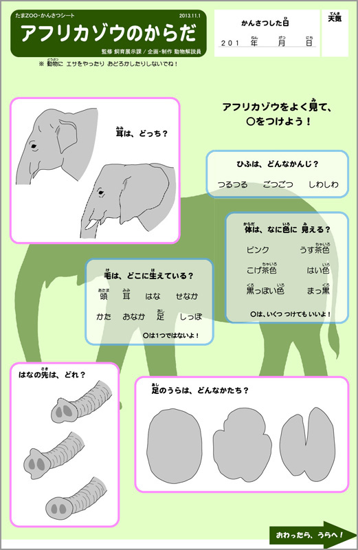 かんさつシート (アフリカゾウ・からだ) | かんさつシート (アフリカゾウ・くらし) | 「動かない」(?)アフリカゾウ |