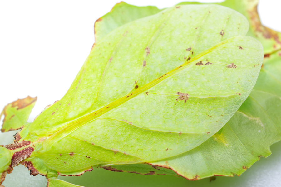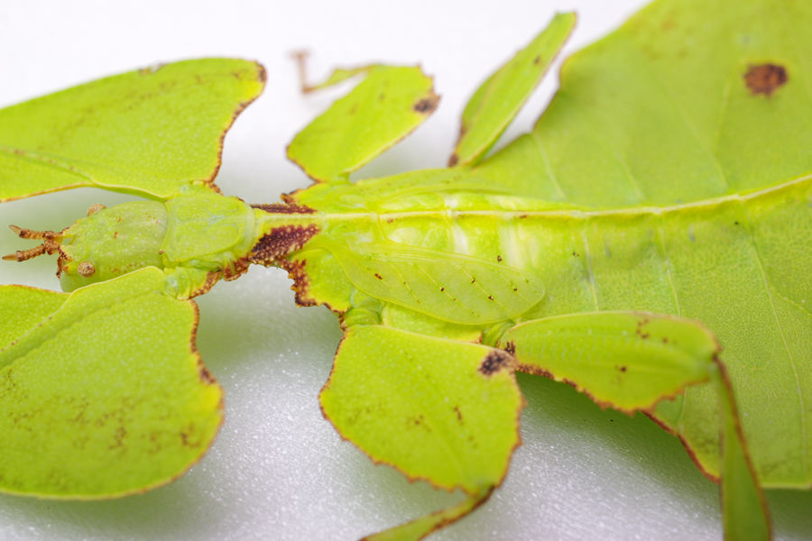 成虫と幼虫の外見はとてもよく似ていますが、よく見ると成虫は背中に翅が生えています。しかし、昆虫の翅は一般に前翅と後翅の2対生えているのですが、オオコノハムシのメス成虫には前翅1対しかありません。しかも、背中を覆う役割しか果たしておらず、飛ぶような仕組みにもなっていないのです。そのかわり、翅には葉脈のような精巧な模様がほどこされていて、左右の翅をあわせると、ちょうど一枚の葉になるようにできています(写真2、3)。