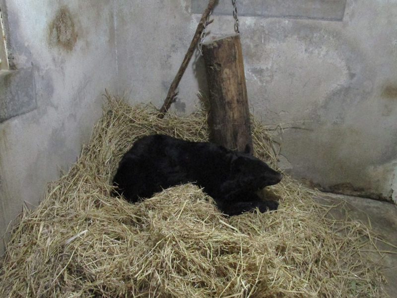 冬眠用の部屋へ移動したタロコは翌日から徐々に丸まった姿勢で寝る時間が増え、呼吸数は1分間に4~6回程度(通常の睡眠時は8~9回)と少なくなりました。冬眠中のツキノワグマはいっさい排便をせず、えさも食べないと言われています。今回のタロコは時々起きて排便することがあり、えさを要求することもあったので、少量の煮たサツマイモとシラカシの枝葉を与えました。この排便と少量のえさを食べる行動は2か月弱続き、その間の便状はとても良好でした。