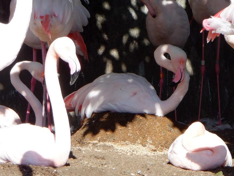 フラミンゴの繁殖期は、発情し、集団でのディスプレイを経てカップルとなるペアをつくるところから始まります。そして成立したペアは行動をともにするようになり、交尾がおこなわれます。その後営巣するための場所取りをおこない、気に入った場所が見つかると土をかき集め、バケツをひっくり返したような塚状の巣台に卵をひとつ産んで、オスとメスで熱心に抱卵を始めます。