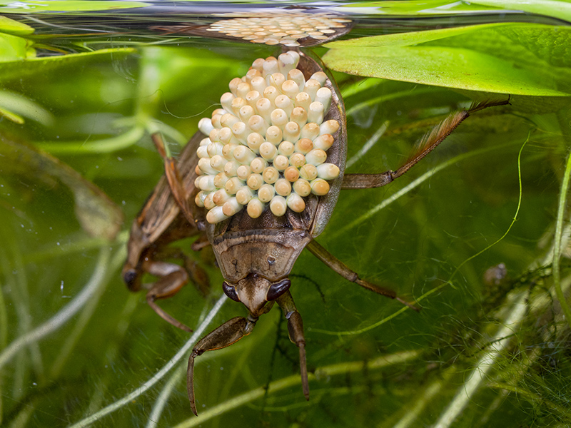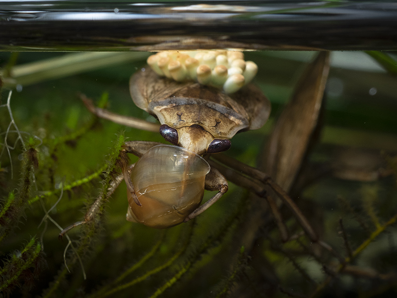 オオコオイムシは、オスが卵を背負って世話すること(写真①:オオコオイムシ、写真②:卵を背負うオスの成虫)が特徴のカメムシ目の昆虫で、カマのような前脚を使って捕らえた獲物に、針状の口(口針)を刺し中身を溶かして食べてくらしています。幼虫も成虫も水辺の小さな生き物を獲物にしていますが、対象としている獲物のなかでも特徴的なのが巻貝です。