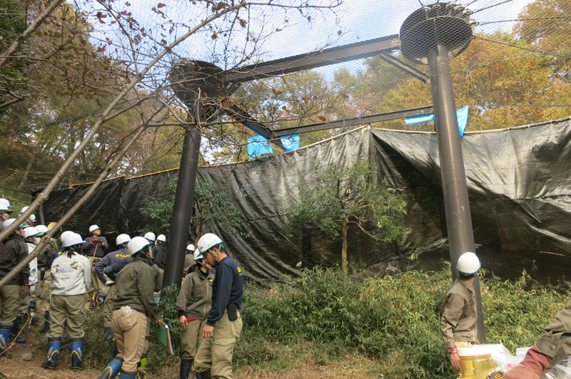 そして、コウノトリの捕獲はとても難しく危険な作業のため、当日はなんと30人以上の体制で臨みます。当然、ふだんコウノトリを担当している職員だけでは足りないので、さまざまな動物担当の職員に手伝ってもらいます。30人を超える人数での作業なので作業内容、手順、役割分担などの共通理解がとても重要になります。