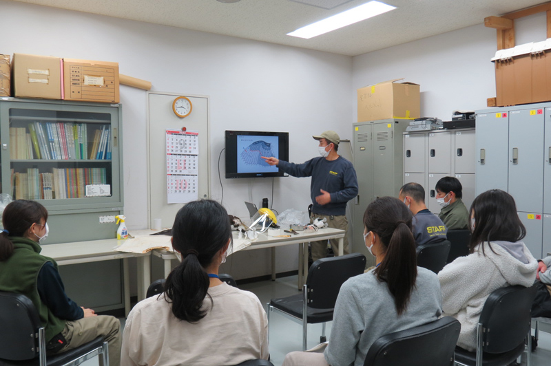 さらに、初めて参加する職員には映像や剥製を使った事前講習会もおこないます。コウノトリは長くて太いくちばしを使って抵抗するので、顔や頭を守るためのフェイスシールドやヘルメットは必須です。