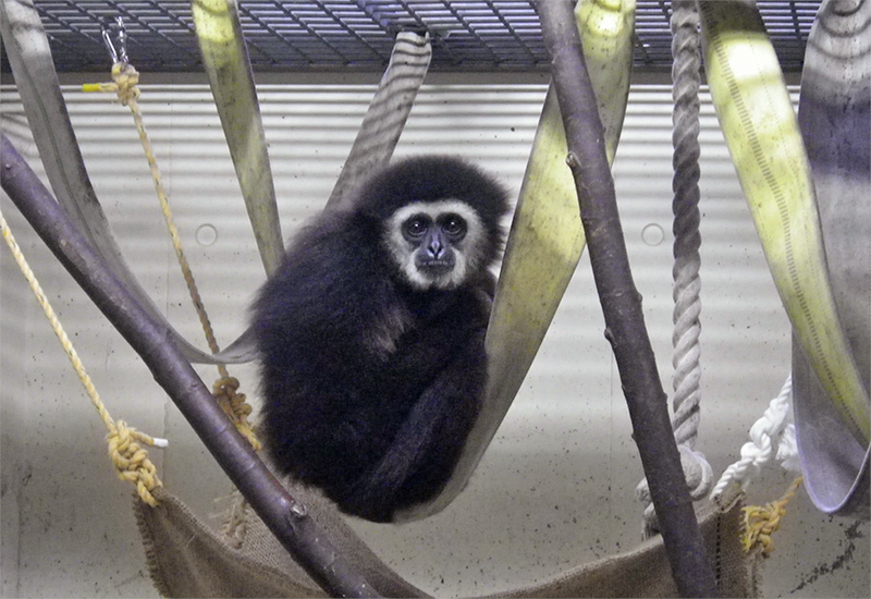 多摩動物公園の正門から、広い園路をまっすぐ進んだ最奥にオランウータン舎があります。その一角のアムールトラ寄りのところで、シロテテナガザルの家族がくらしています。