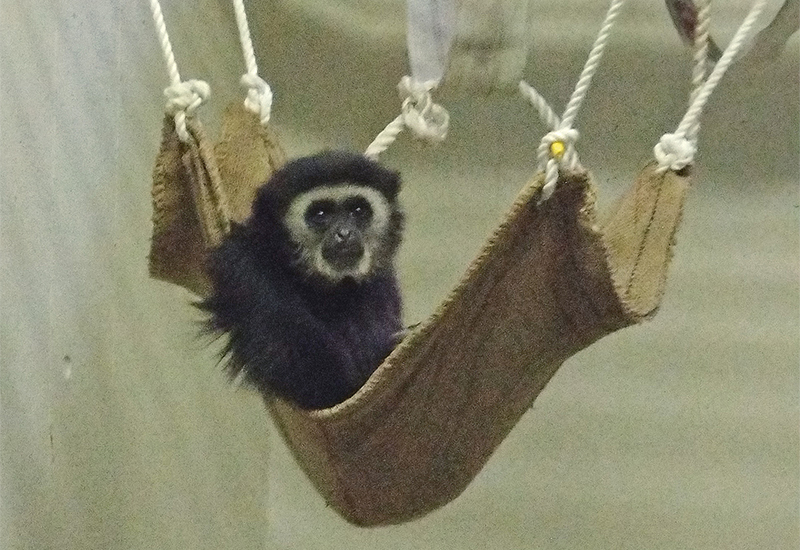 昼間は3頭とも、運動場でのんびり日向ぼっこをしたり、長い腕を使ってあちこち渡ったり、独特のよく響く声で鳴き交わしたりしています。夕方になると、寝室に移動し、麻袋のハンモックやU字につけてある消防ホースに座って休みます。