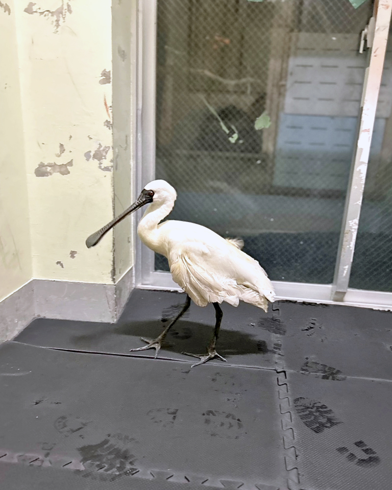 野外で保護されたクロツラヘラサギの来園)これらの個体は環境に慣れたあとに、園内の繁殖棟でペアを作り、繁殖を目指します。