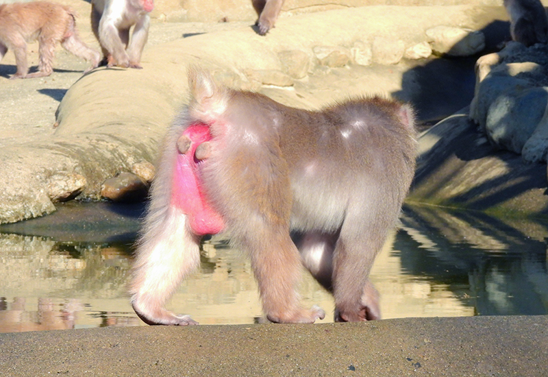 ニホンザルはその生理・生態的特徴として、おおよそ9月〜12月にかけて交尾・妊娠が可能になります。9月になると少しずつサルの体や行動が変化してきます。オスは肩を怒らせ尾を挙げ、顔とお尻が赤みがかり、精嚢には睾丸が落ちて鶏卵大にふくらみます。