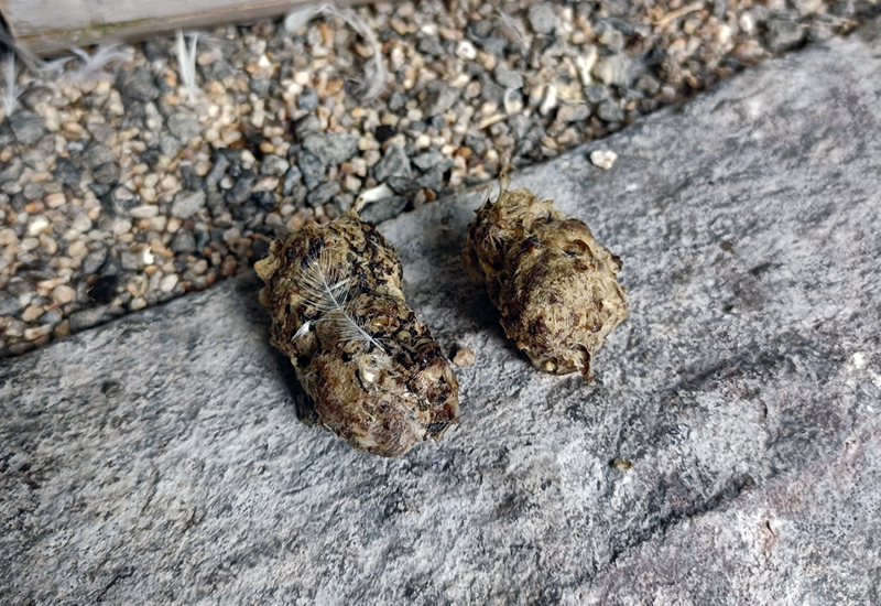 また、猛禽類は「ペリット」という消化できなかった大きな骨や毛などの塊を吐き出す習性があります。ペリットの排出には胃の運動を正常に保つ役割があり、ペリットを吐かない状態が続くと消化機能の低下や不調にもつながります。そのため骨や毛皮がそのままのえさを与えることによりペリットを吐き出す習性を促しています。