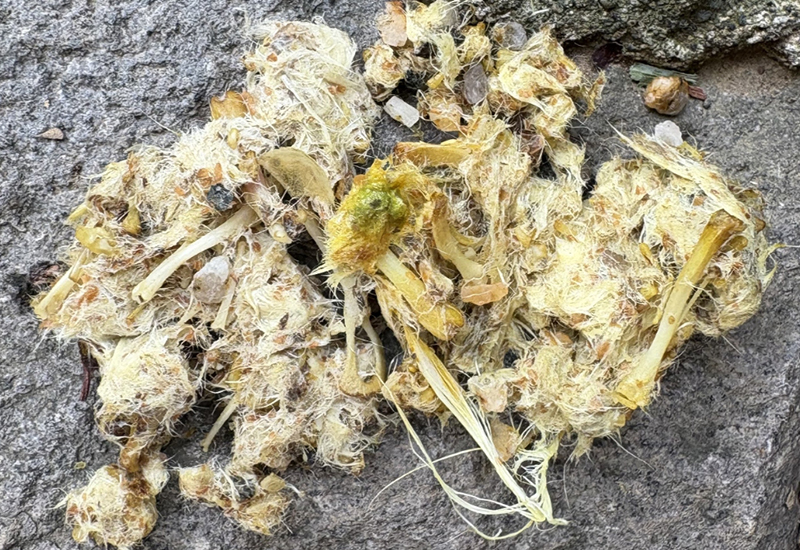 | フクロウが吐き出したペリット | ペリットをほぐしたもの 白い棒状のものがネズミ類の骨 |
