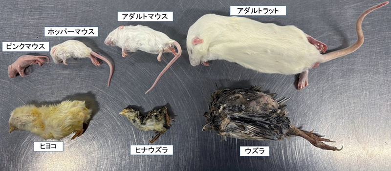 冷凍のネズミ類の下が左から冷凍ヒヨコ、ウズラのひな、そして成鳥です。同じ鳥類のひなですがヒヨコは高脂肪、高エネルギーなのが特徴で、ウズラは高たんぱく低脂質なのが特徴です。