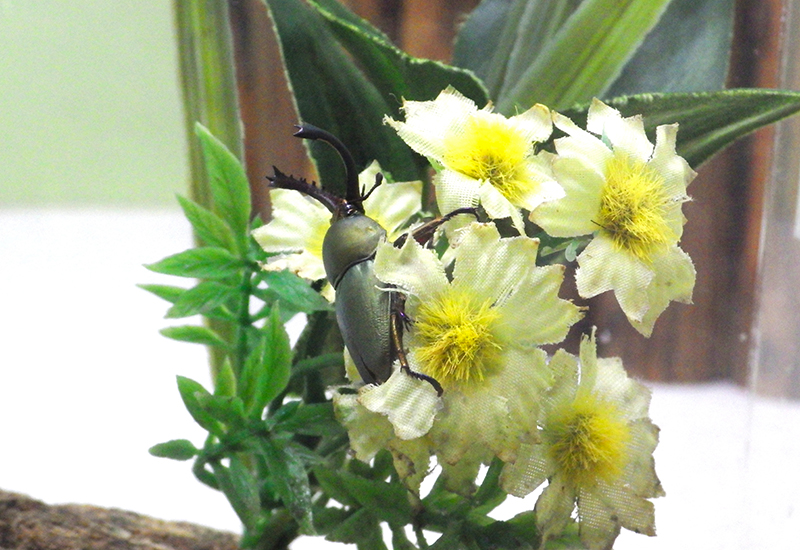 多摩動物公園の昆虫園にも、キラキラ輝いている虫を展示しています。昆虫園本館2階で展示している「パプアキンイロクワガタ」は、その名のとおり金属光沢のある美しいクワガタです。体長は2~5cmと小さいものの、黄緑、緑、青、紫、赤色など体色の多様性が魅力です。飼育・繁殖も比較的簡単なことから、愛好家が多い虫のひとつです。