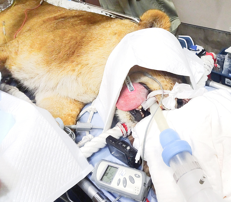 気管内チューブを使用して麻酔中のライオンの呼吸管理をしているようす