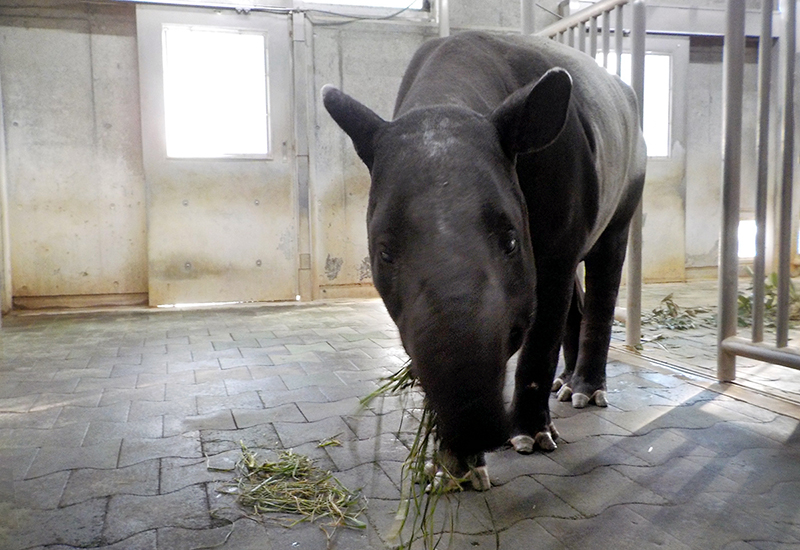 多摩動物公園では、マレーバクに根菜類、枝葉、乾草、青草、草食獣用ペレット、ヘイキューブなどを個体に合わせて内容や量を調整し与えています。しかし、昨年の夏ごろからリザの採食量が安定しなくなりました。体重が減り体力も落ちてしまったので、活動時間も減少しています。食べる意欲はあるのですが偏食が強くなってしまったため、リザが積極的に食べてくれるように、給餌方法にさまざまなくふうを凝らしました。