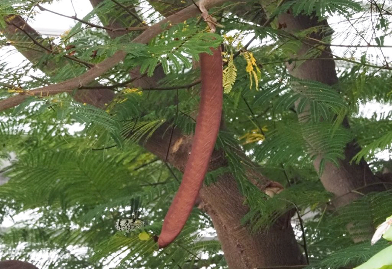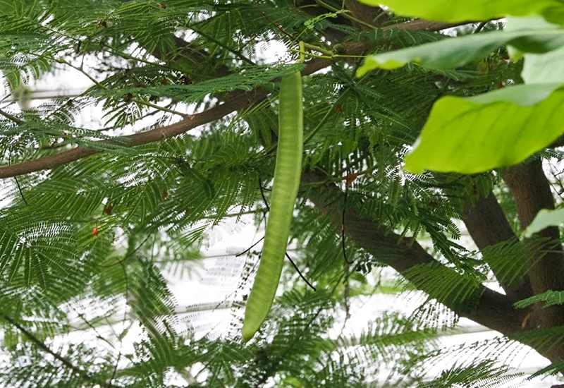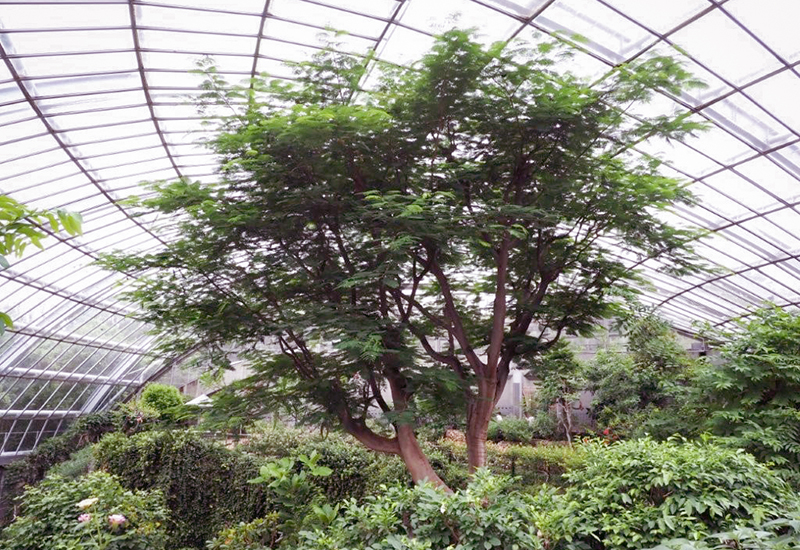 これはホウオウボクという名のマダガスカル原産のマメ科の高木で、沖縄では公園に植えられたり、街路樹として活用されたりしています。温室内に植樹されてまもなく40年になる、まさにシンボルツリーで、この木を目当てに大温室に来てくださる熱心なファンの方もいます。