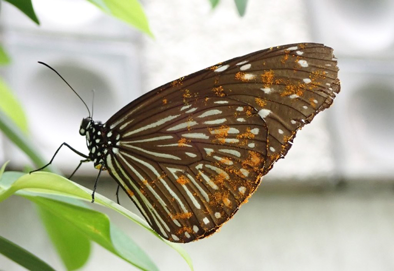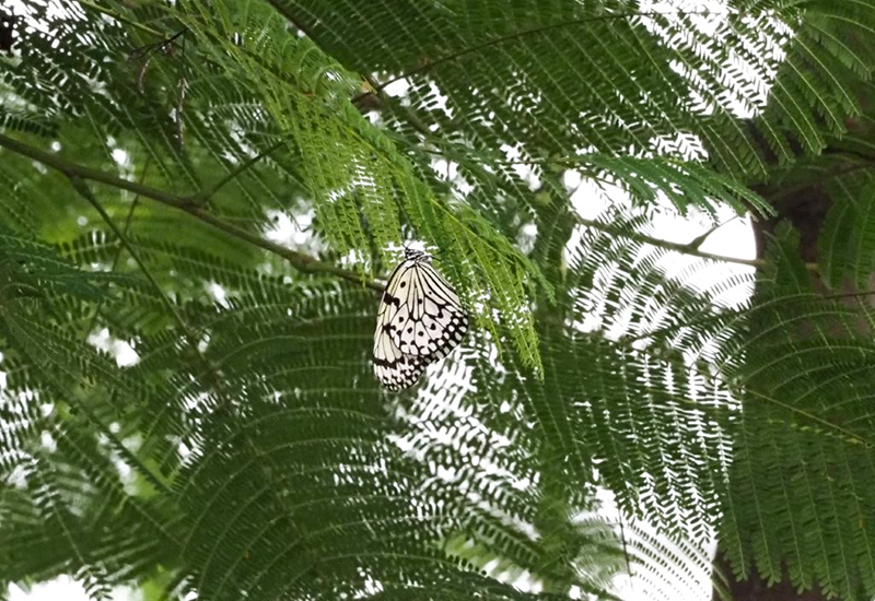 夕方になり日が陰ると、多くのチョウがホウオウボクの梢で休みます。薄暗い雨の日なども同様です。大温室内で飛んでいるチョウが少ないな、と思ったら、ホウオウボクの梢も観察してみてください。きっとたくさんのチョウが隠れているはずです。