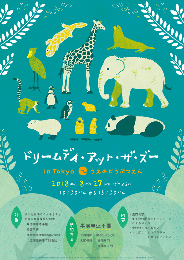 | 日時 | 2018年8月27日(月) 10時30分~15時30分 入園受付は10時30分から13時まで。 ※雨天でも実施します。 ※当日は休園日です。 | | 場所 | 全園(ジャイアントパンダもご覧いただけます) | | 対象 | 「身体障害者手帳」「療育手帳(愛の手帳)」「精神障害者保健福祉手帳」「小児慢性疾患受給者証」をお持ちのお子さまとそのご家族及び介助者 ※申請中の方を含みます。 | | 参加方法 | 事前のお申込みは不要です ※東園・表門もしくは西園・弁天門で上記の手帳などをお見せください。 ※グループ全員おそろいのうえでご入園ください。 ※西園・池之端門からの入園はできません。 | | 交通 | 上野動物園交通アクセス | | 駐車場 | 上野動物園には駐車場がありませんので、近隣の駐車場をご利用ください ※車椅子・ストレッチャーをご利用の方は、京成上野駅駐車場か上野中央通り地下駐車場をご利用のうえ,弁天門からの入園が便利です。 | | その他 | - 展示動物やイベント内容は、動物の状況や天候などにより予告なく中止・変更する場合があります。