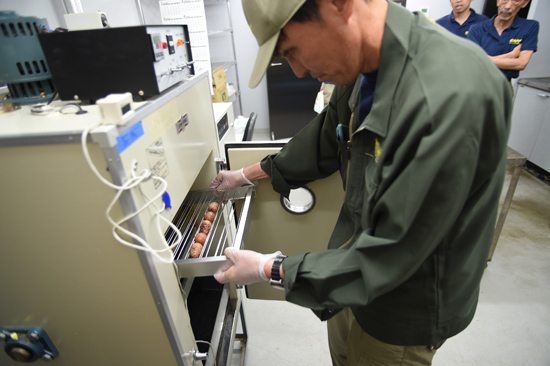 上野動物園への到着後、容器を丁寧に運び、飼育室で卵を取り出して孵卵器に入れました。