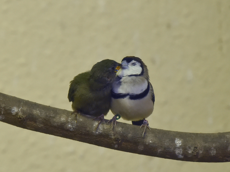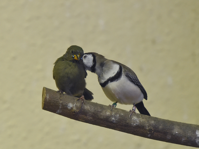 今年5月と8月に1羽ずつ、ひなが巣立ちました。この部屋では例年とは違う不思議な行動を観察できました。同居しているカノコスズメが、親よりもひなのそばにぴったりと寄り添っているのです。