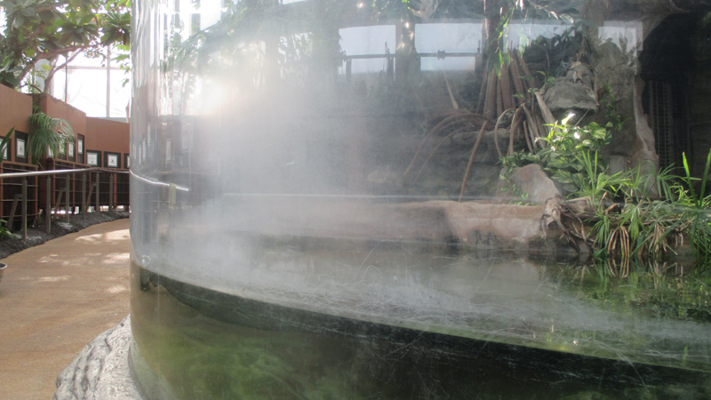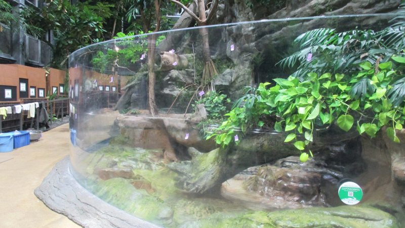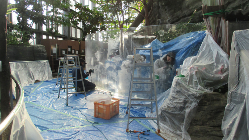 亜熱帯環境を再現している展示場では、展示をすべてアクリル水槽(塀)越しにご覧いただいていますが、このアクリルの維持管理はけっこう手間がかかります。日ごろからこまめに手をかけないとすぐカルキが付着して白濁したり、展示している動物の爪や頭突きで傷がついて透明度がそこなわれたりと、日々劣化していきます。