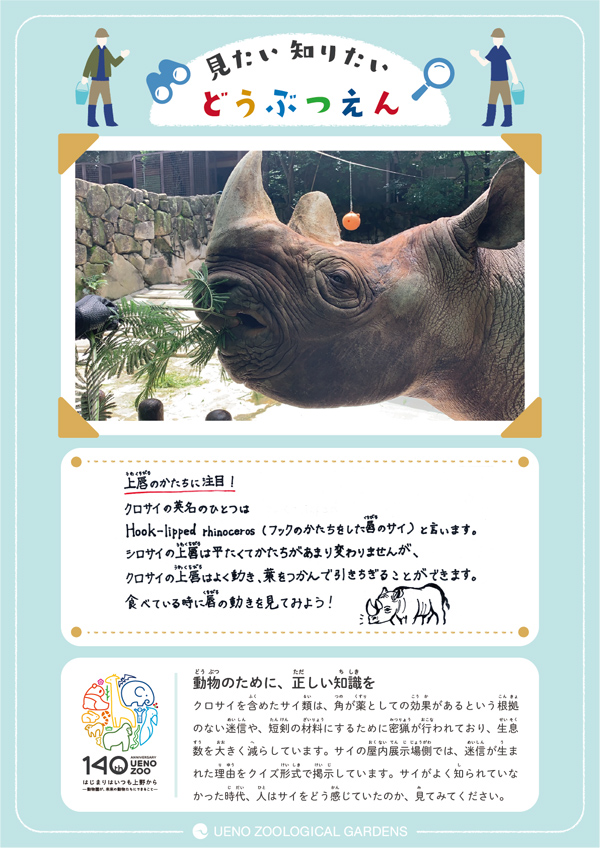 今回掲示したパネルは12枚。飼育担当者がみなさんに見てほしい、知ってほしいポイントを手書きで解説しました。あわせて、その動物が野生で置かれている現状、当園が取り組んでいる保全活動に至るまで、幅広い内容をお届けしました。