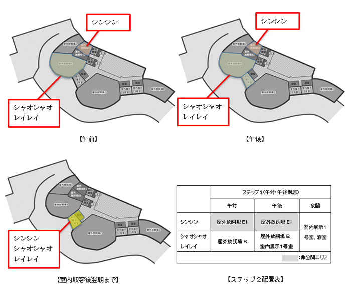 午前および午後は屋外でシンシンとシャオシャオ、レイレイを別居させ、室内収容後翌朝まで同居させます。