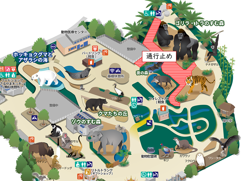 園路改修工事のため、東園のゴリラ・トラのすむ森の園路の一部を、2月10日(火)より終日通行止めといたします。
