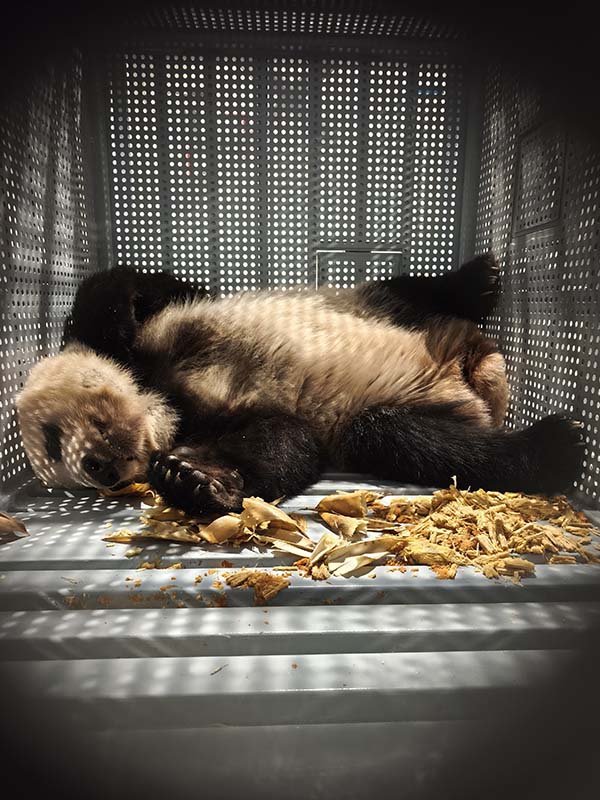 機内では、中国の専門家と長く2頭を担当してきた飼育係が同乗し、定期的に見回り、健康状態を確認しました。シャオシャオは犬座りの姿勢で周囲を警戒するようすが見られましたが、時間の経過とともに徐々に落ち着いていきました。一方、レイレイは比較的落ち着いて過ごし、仰向けになって休息する姿も確認されました。輸送箱内に入れたえさについては、レイレイはほぼ食べ終え、シャオシャオも一部を食べていることが確認できました。また、水皿の水量の変化から、レイレイが飲水していたようすもうかがえました。機体が大きく揺れる場面もありましたが、2頭とも落ち着きを失うことなく、無事に成都天府国際空港に到着しました。
