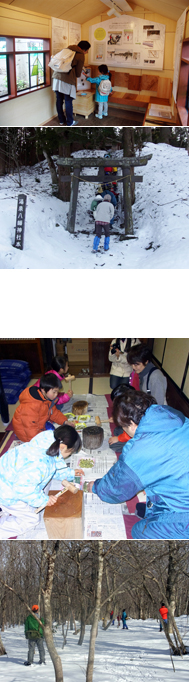 企画展を開催するきっかけとなったのは、2011年2月26日~27日に東京動物園友の会会員を対象に実施した「ウサギ追いと里山のくらし体験」ツアーです。ツアーでは、天栄村でおこなっている「巻き狩り」によるウサギ猟をヒントに開発された観察プログラム「フォトハンティング」を体験しました。ウサギを追う側と、待ち伏せしてカメラで撮影する側に分かれ、雪上を歩きながら、休息しているノウサギを追い出して観察する、という内容です。