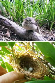 野生では親鳥がさまざまな昆虫やクモなどをひなに与えます。動物園では、コオロギやブドウ虫(ガの幼虫)を用意しましたが、なるべくいろいろなものを与えて親に選ばせたいと思い、園内でバッタなどを採集しました。ちょうど夏休みの真最中で、虫かごをもって虫採り網を振っていると、いつの間にか子どもたちに囲まれていました。「このバッタあげる!」と手伝ってくれる子も多く、そのおかげかホオジロのひなは順調に成長し、8月30日に無事巣立ちました。しかし、まだ上手に飛ぶことができずに地面にペタンと座っている状態で、餌も親鳥からもらっていました。