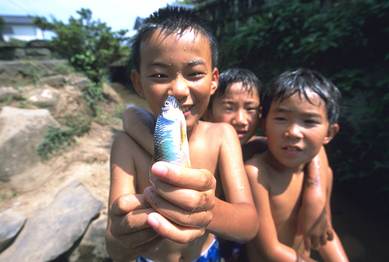 水辺を日常的な遊び場にしている子どものことを私は親しみを込めて「川ガキ」と呼んでいます。川ガキは自宅から水着姿のまま水辺へ向かい、魚などを追いかけ、友だちやきょうだいと泳いだりして遊んでいます。どの子もはちきれんばかりの笑顔をしているのが特徴で、川ガキが〝生息〟する地域では、そこに暮らす大人たちも水辺に関心がある傾向にあります。水辺遊びの楽しさを知るだけでなく、どこが危ないかを地域が知り、見守っていたりするのです。