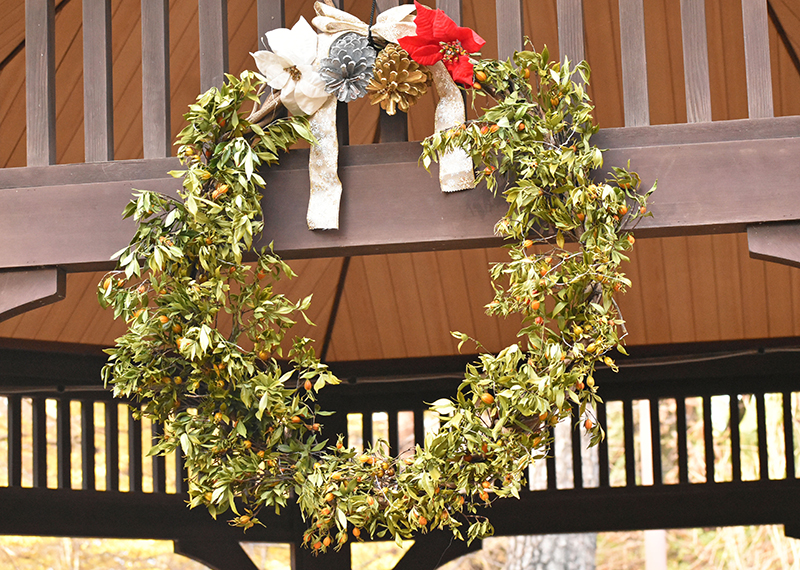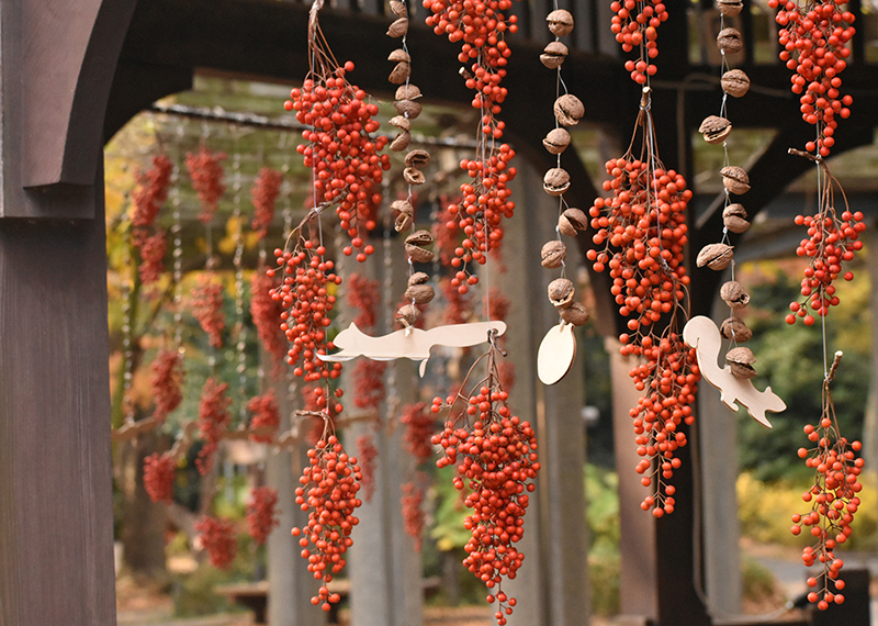 井の頭自然文化園では、園内の植物や身近な自然素材を使って、リースやオーナメントなどの冬を彩るかざりつけをおこなっています。地球にやさしい素材を使い、樹木に囲まれた園内の景色に溶け込むような、心がほっとあたたかくなるかざりつけです。