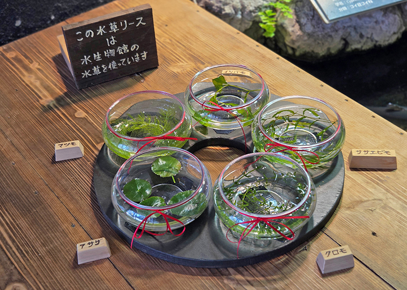 井の頭池には様々な水草が自生しており、水生物館では水草の生育にも力を入れています。そこで水生物館の飼育担当者と相談して水草リースをつくりました。