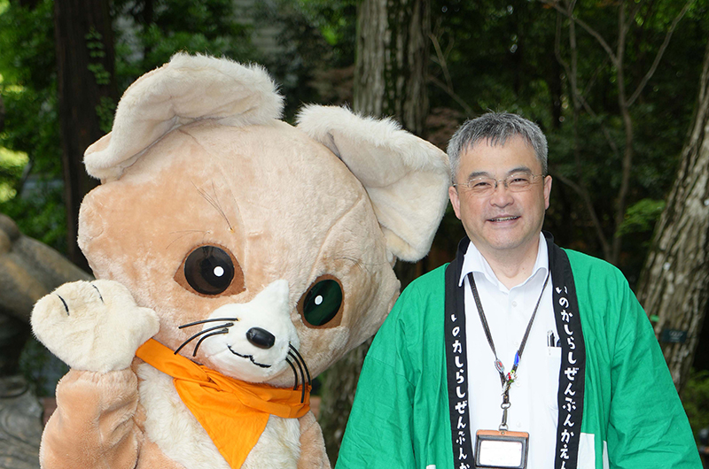 新春にご来園いただいた皆さんを、園長と着ぐるみの動物がお出迎えします。