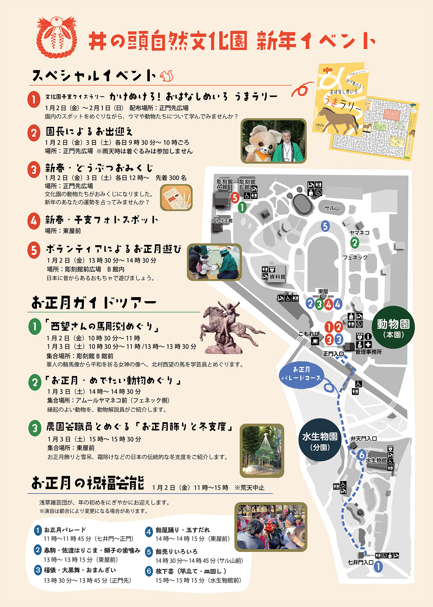 (2025年12月23日:「【午年スペシャル】西望さんの馬彫刻めぐり」「お正月・めでたい動物めぐり」「農園芸職員とめぐる お正月飾りと冬支度」「ボランティアによるお正月遊び」を追加)