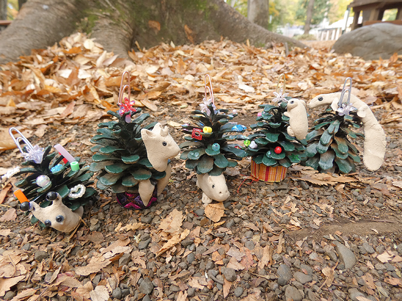 動物まつぼっくりを釣って、かざりをつけます。きれいなまつぼっくりクリスマスツリーをつくってみましょう。
