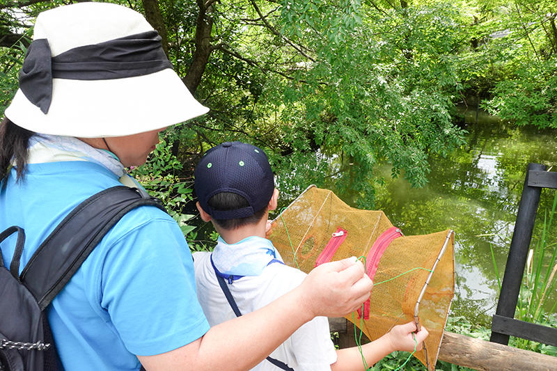「井の頭池いきものたんけん」、昔の自然な姿を取り戻そうと「かいぼり」や外来種の駆除をおこなった井の頭池を観察します。どんないきものが今の井の頭池にくらしているのでしょう? 水の中でくらすいきものは道具を使って、水の上でくらすいきものは自分の目で調べます。