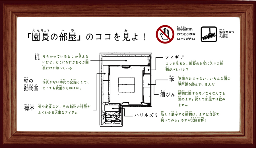 この室内の「いきもの広場」の隣には、“架空の園長の部屋” を設置しました。