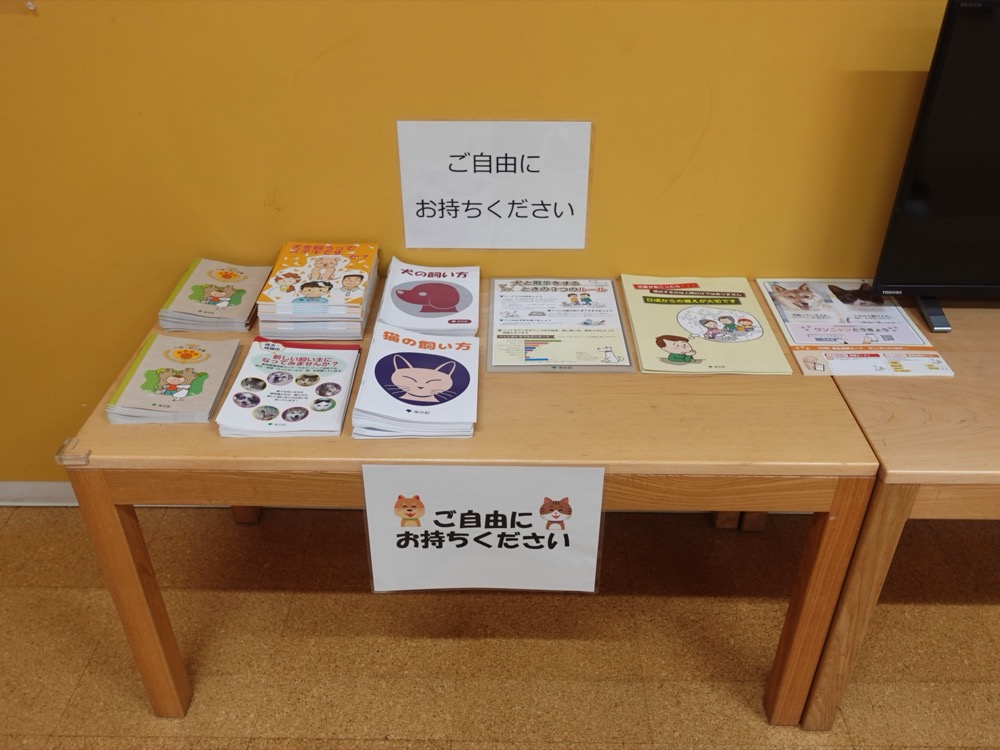 犬や猫の飼い方、飼い主としての心構えなどに関するパンフレット、保護した犬や猫の譲渡についてのパンフレットなどを配布。