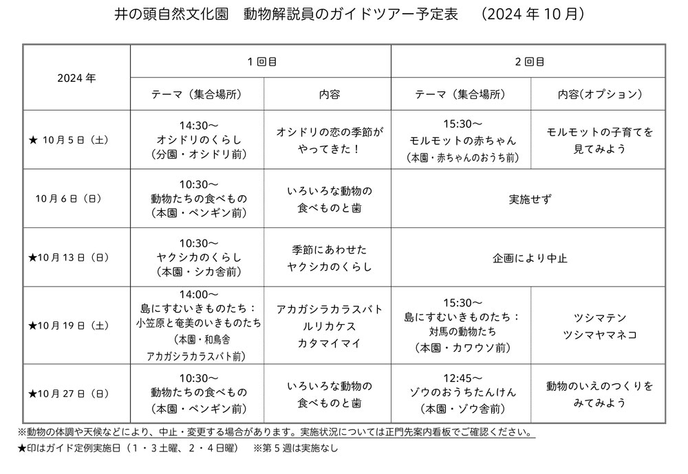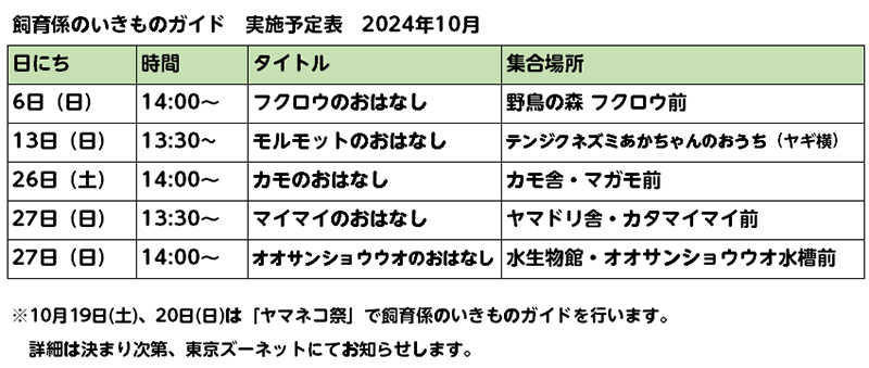 ※動物の体調管理などの都合により、予告なく中止や変更をする場合がありますので、ご了承ください。 | |  |