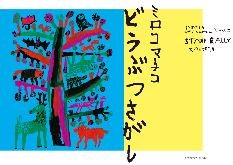 井の頭自然文化園と吉祥寺パルコを会場として、井の頭自然文化園のどうぶつたちを集めるスタンプラリー。スタンプのどうぶつはミロコマチコさんの作品です。スタンプを3つ集めた方にオリジナルバッジをプレゼント!(プレゼントがなくなり次第終了です)