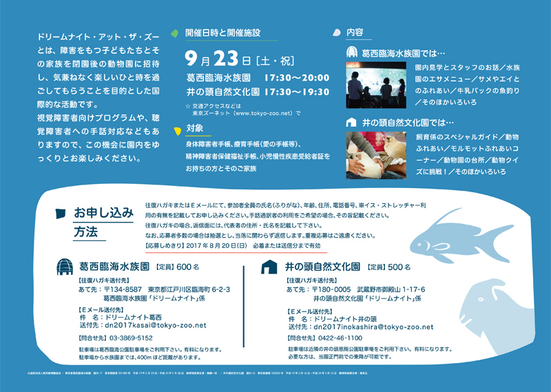 2017年9月23日(土・祝)に、葛西臨海水族園と井の頭自然文化園で「ドリームナイト・アット・ザ・ズー&アクアリウム in Tokyo」を開催します。