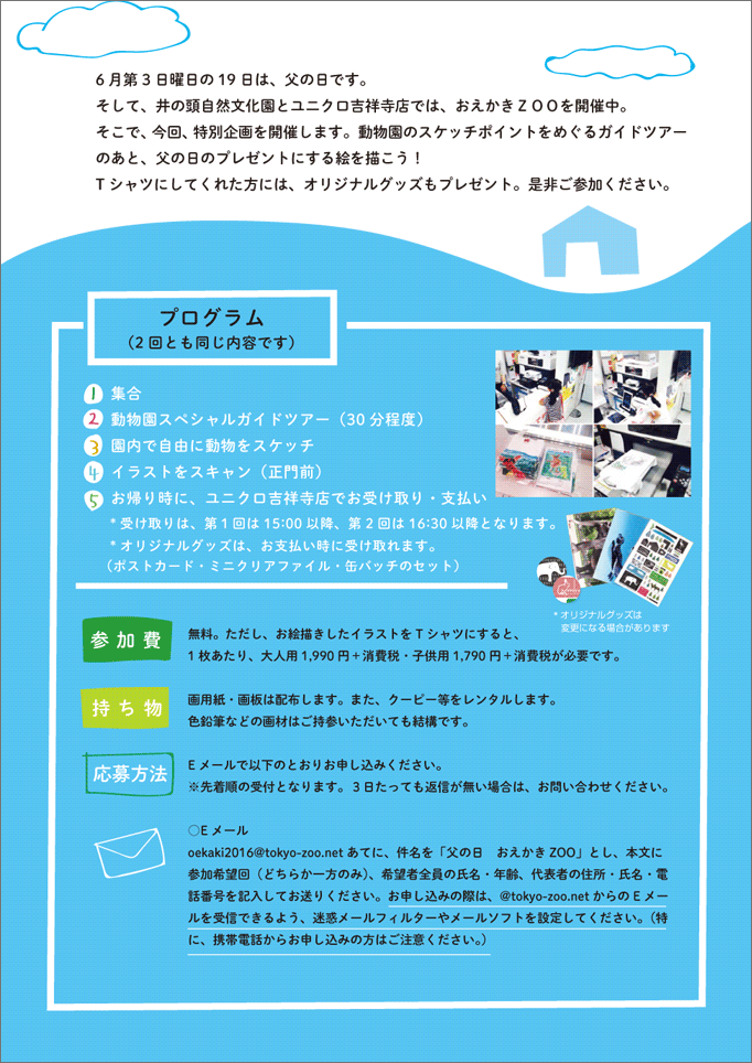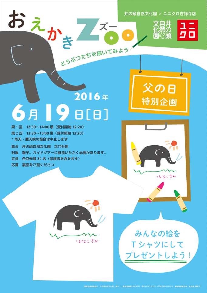 まもなく父の日。今年(2016年)は6月19日です。井の頭自然文化園とユニクロ吉祥寺店は2016年6月1日から共同企画の「おえかきZOO」を開催しますが(お知らせ)、それに合わせて父の日の特別企画を開催します!