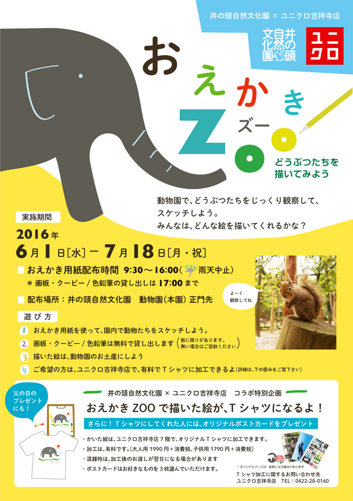 ユニクロ吉祥寺店との共同企画として、おえかき用紙と画材を無料で貸し出し、どうぶつたちをスケッチしてもらう「おえかきZOO」を、昨年(2015年)に引き続き、今年も開催します。