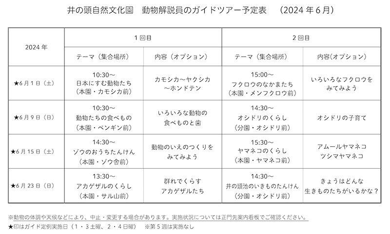 ※動物の体調管理などの都合により、予告なく中止や変更をする場合がありますので、ご了承ください。