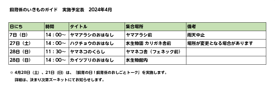 ※ 4月は「飼育の日」イベントの実施にともない、ほかの月とは実施日が異なります。