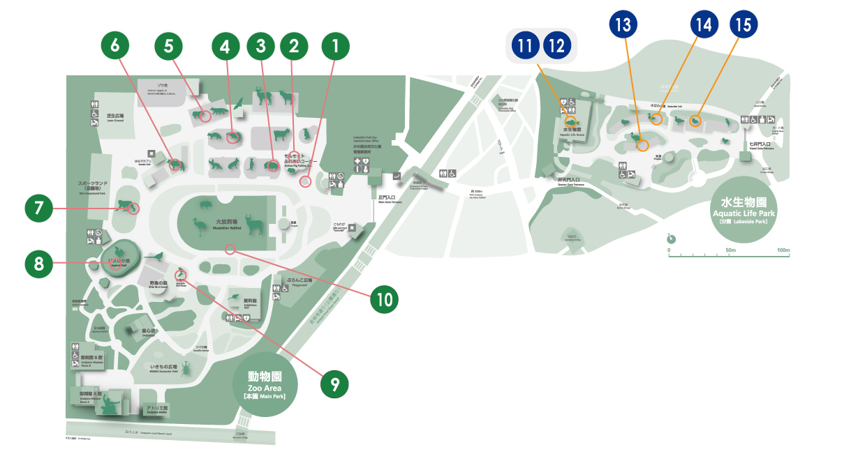 ⑦アカゲザル ⑧ニホンリス ⑨和鳥舎・ウグイス