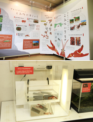 井の頭自然文化園水生物館で2013年3月20日から開催している特設展示「身近な外来生物アメリカザリガニ」では、生き物としてのアメリカザリガニの特徴や、引き起こされる問題、駆除が難しいことなどを大きなパネルで解説しています。また、アメリカザリガニを観察しやすいように3つに分け、大小さまざまなサイズの個体を多数入れた水槽、お腹側が見えるようにくふうして雌雄が見わけられるようにした水槽、水草を植えて食べるようすが見られるようにした水槽を展示しています。